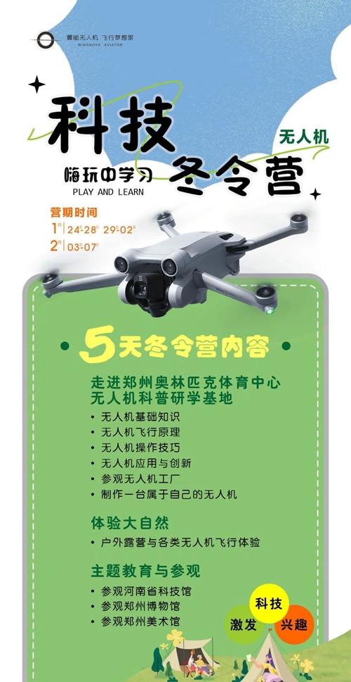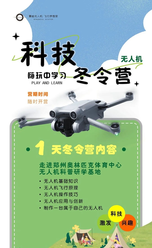 鄭州奧體翼能無人機研學基地是集無人機科普、研學、開發(fā)、應用、賽事運營的綜合服務平臺,不僅擁有1000余平方米的無人機科普教育基地,還擁有無人機駕駛執(zhí)照的培訓資格。寒假期間,依托鄭州奧體中心開闊場館,翼能無人機將科普知識與實操表演完美結(jié)合,分別開設1至5天不等的科技冬令營,代領孩子們放飛科技夢,在嗨玩中學習。