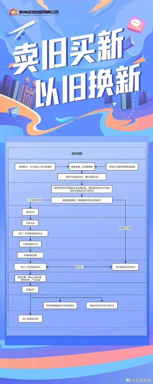 鄭州房產(chǎn)市場“賣舊買新、以舊換新”旨在滿足群眾改善性住房需求。具體來講,由政府指定收購主體—鄭州城市發(fā)展集團(tuán)有限公司與具有改善需求的換房群眾進(jìn)行洽談,通過價格評估、銀行貸款等一系列工作流程,收購群眾二手房源,為群眾購買新房提供資金支持,暢通買賣渠道。此外,群眾也可通過市場化方式進(jìn)行交易。