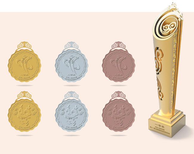 獎杯《龍鳳書卷》,靈動而不失莊重。獎杯上端外觀基于會徽核心圖形“龍鳳”,具有較高的辨識度。龍鳳組成“11”圖案,呈相依相伴騰飛之勢,中間升騰古老的祥云圖案,彰顯中華文明生生不息的活力。獎杯底座由三級臺階組成,寓意“三個離不開”(漢族離不開各少數民族,各少數民族離不開漢族,各少數民族之間也互相離不開)思想和步步高的美好祝福,激勵運動員奮力拼搏。