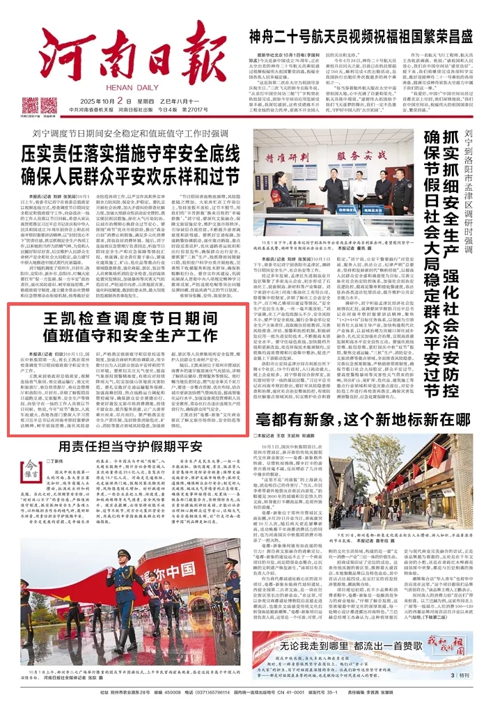 王凱來到省政府總值班室,視頻連線省氣象局、省交通運輸廳、省文化和旅游廳、省自然資源廳、省應急管理廳和洛陽市、開封市,詳細了解假期首日道路交通、文旅服務、安全生產等情況,向堅守在一線的工作人員致以節(jié)日問候。他說,今年“雙節(jié)”疊加,人流車流量大,各地各部門要深入學習貫徹習近平總書記在河南考察時重要講話精神,樹牢底線思維,強化風險意識,嚴格落實值班值守和信息報送等制度,加強會商研判和協(xié)調聯(lián)動,用辛勤付出為人民群眾創(chuàng)造平安祥和的節(jié)日環(huán)境。要密切關注天氣變化,提高氣象預報預警精準度,有效應對持續(xù)降雨天氣,切實加強山洪地質災害防范。要扎實做好交通運輸服務保障,加強高峰時段、熱點線路運力調配和管控疏導,確保群眾安全便捷出行。要更好激發(fā)文旅市場消費潛能,持續(xù)豐富業(yè)態(tài),提升服務質量,讓廣大游客乘興而來、盡興而歸。要嚴格落實安全生產責任制,及時排查消除?;?、礦山、消防等重點領域風險隱患,加強商超、景區(qū)等人員密集場所安全監(jiān)管,維護人民群眾生命財產安全。