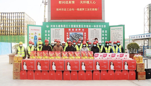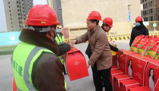 春節(jié)將至,為將工會組織的溫暖及時送到廣大工友手中, 2月7日下午,鄭州市總工會機關(guān)工會主任王銀倉、副主任張翔宇,鄭州地產(chǎn)集團監(jiān)事會主席、工會主席李靜波、女工主任鄭琪在西流湖公司副總經(jīng)理、工會主席昌磊的陪同下,深入中原新區(qū)三十里鋪中安置區(qū)施工現(xiàn)場,開展春節(jié)送溫暖慰問活動。