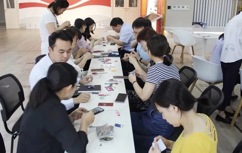 在濃厚的氛圍中,大家開始制作香囊。大伙一邊穿針引線,學(xué)習(xí)香囊制作,一邊互幫互助,相互溝通交流。